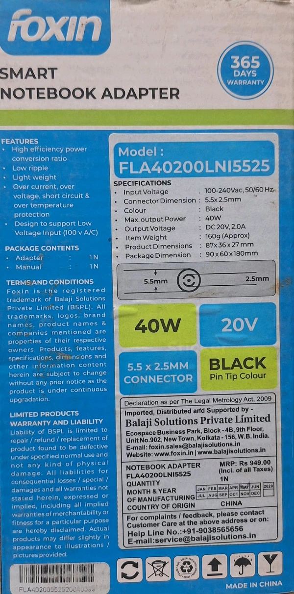 FOXIN SMART NOTEBOOK ADAPTER 40W MODEL:- FLA40200LNI5525
