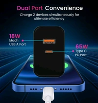 - Dual Ports: Features both USB-C and USB-A ports to charge two devices simultaneously with no compromise on speed.